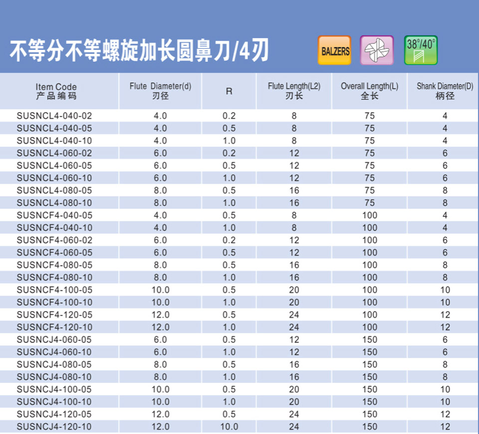 不等分不等螺旋加長圓鼻刀4刃